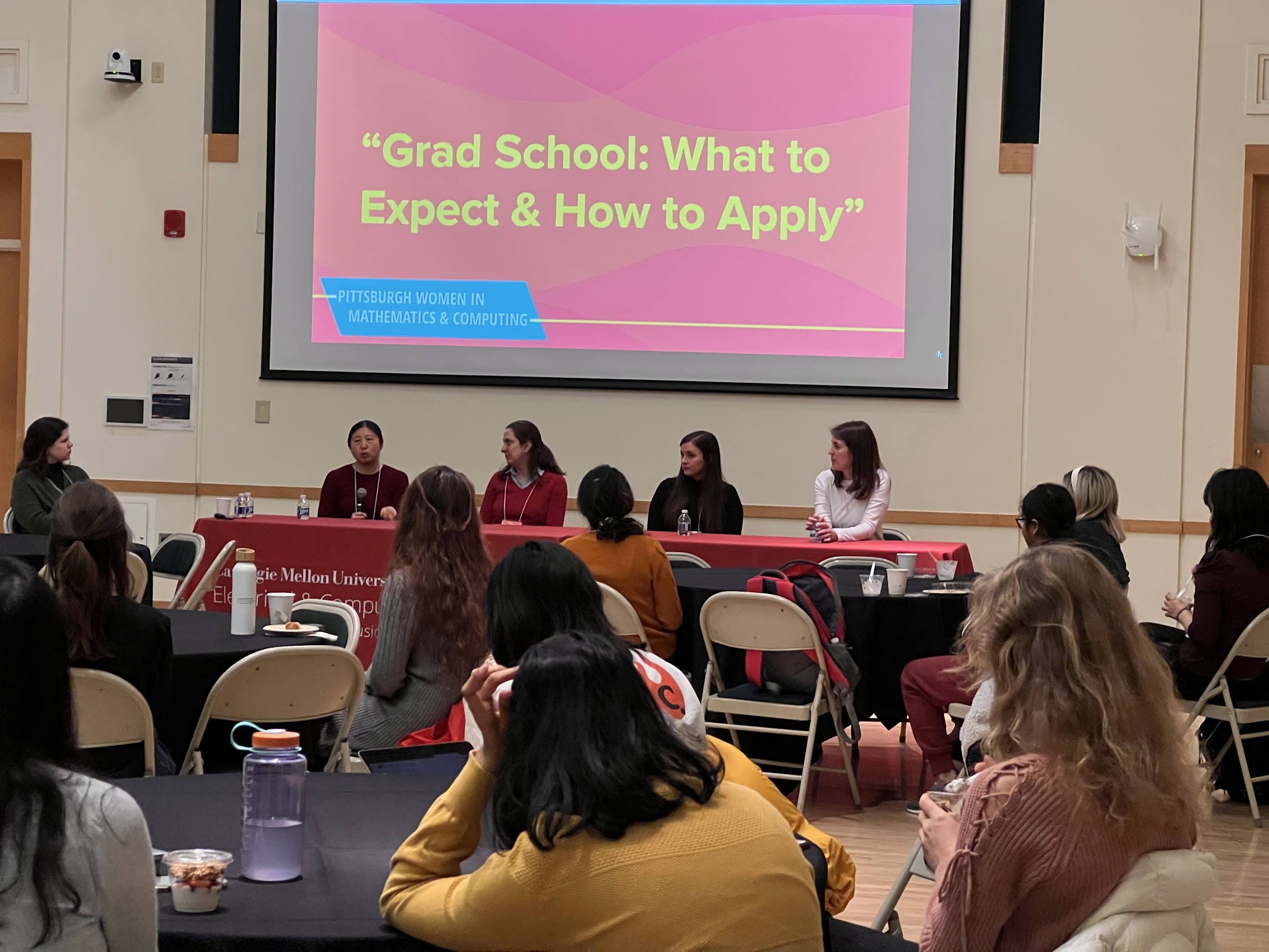 The first-ever Pittsburgh Women in Mathematics and Computing Symposium (WMCS) was hosted at Carnegie Mellon University! The event, which took place on February 24, gathered a number of graduate students, as well as faculty members from various departments including Mathematics, ECE, Computer Science, Statistics, and Robotics. The day-long symposium showcased presentations by faculty and graduate students discussing their research, with the aim of providing undergraduate students insights into the expectations of a research career.